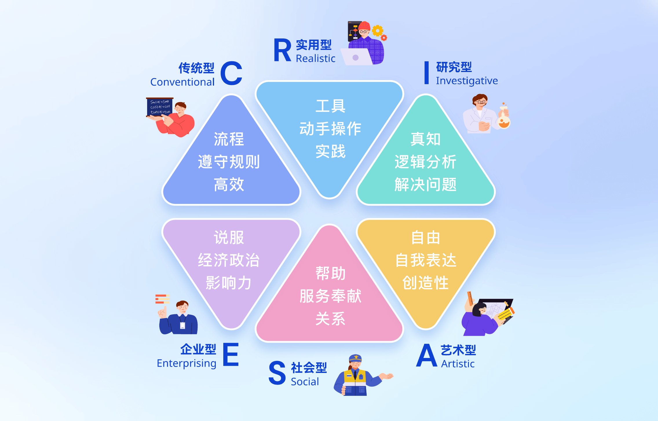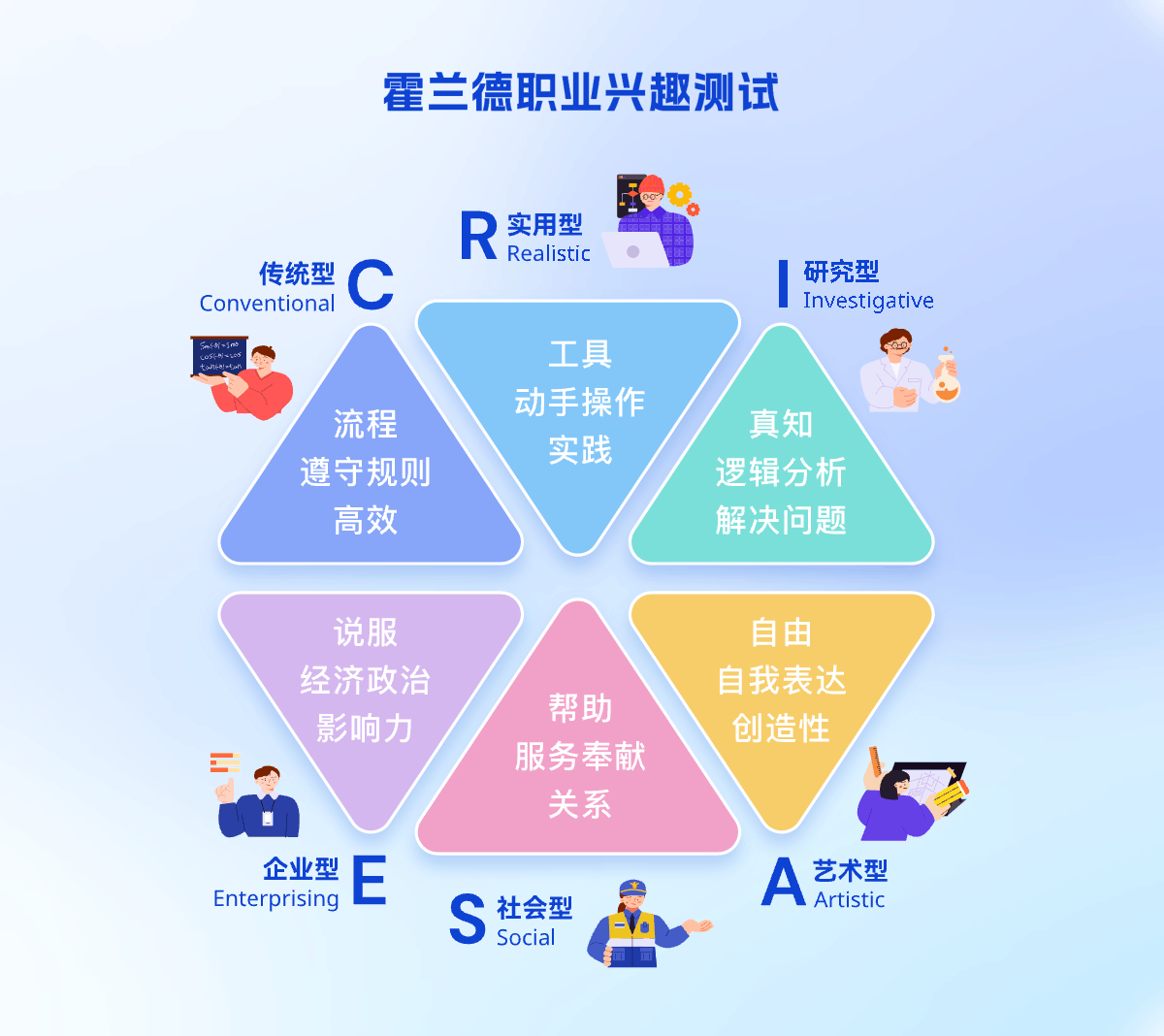《霍兰德职业兴趣测试》是由美国心理学家约翰·霍兰德提出的具有广泛社会影响的职业兴趣理论。他认为个人职业兴趣与职业之间有一定内在的对应关系。根据兴趣不同可分为六个维度,包括现实型、研究型、艺术型、社会型、企业型和常规型。
